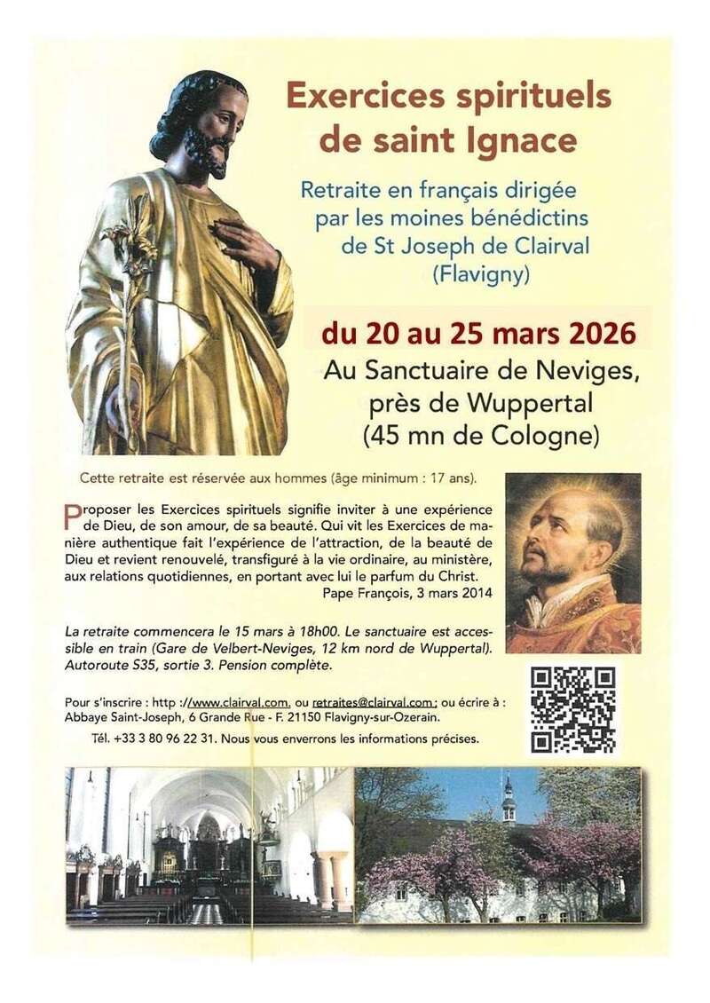 Quoi ? Retraite en silence d'une durée de 5 jours proposée aux pères de famille, qui s'inspire des Exercices Spirituels de Saint-Ignace. La retraite est dirigée par les Pères de l'Abbaye Saint-Joseph de Clairval.
